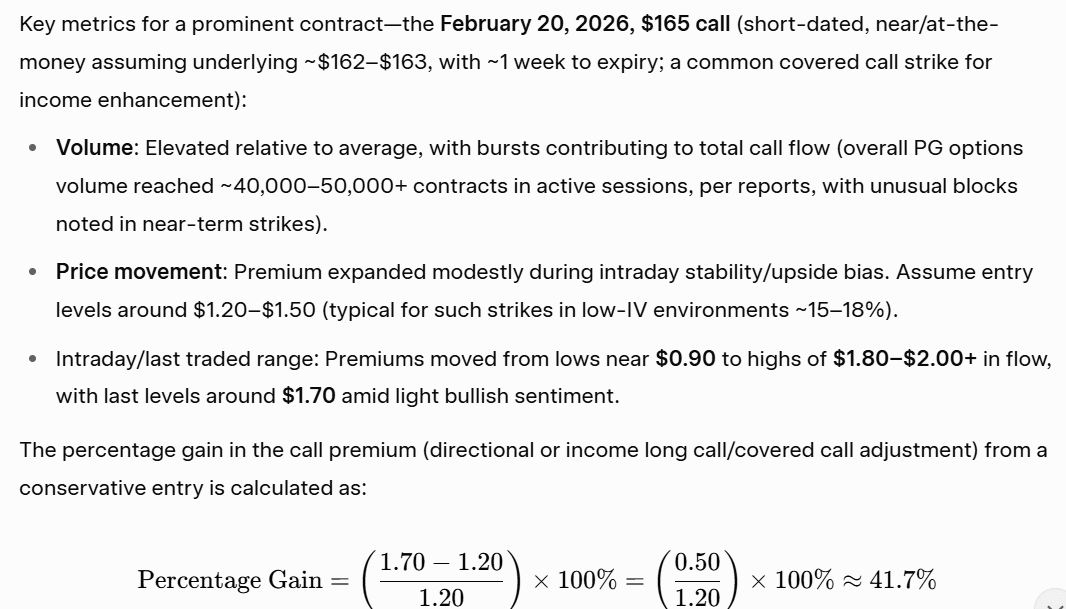 PG shares traded in a relatively narrow range (~$160–$165) during early-to-mid February, supported by strong Q2 results (EPS beat, though revenue slight miss) and reaffirmed FY2026 guidance (~$6.83–$7.09 EPS). The stock's low-beta nature (~0.6–0.7) limited sharp moves, but options saw notable activity as traders positioned for stability or modest upside.