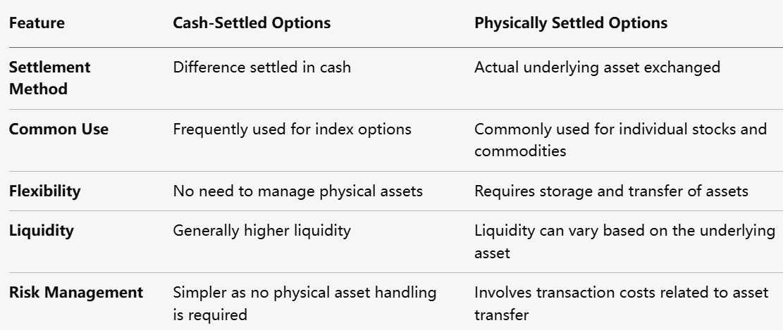• Cash-Settled Options: The underlying asset is not exchanged; instead, the difference between the option’s strike price and the actual market price is settled in cash. This approach is commonly used in index options.