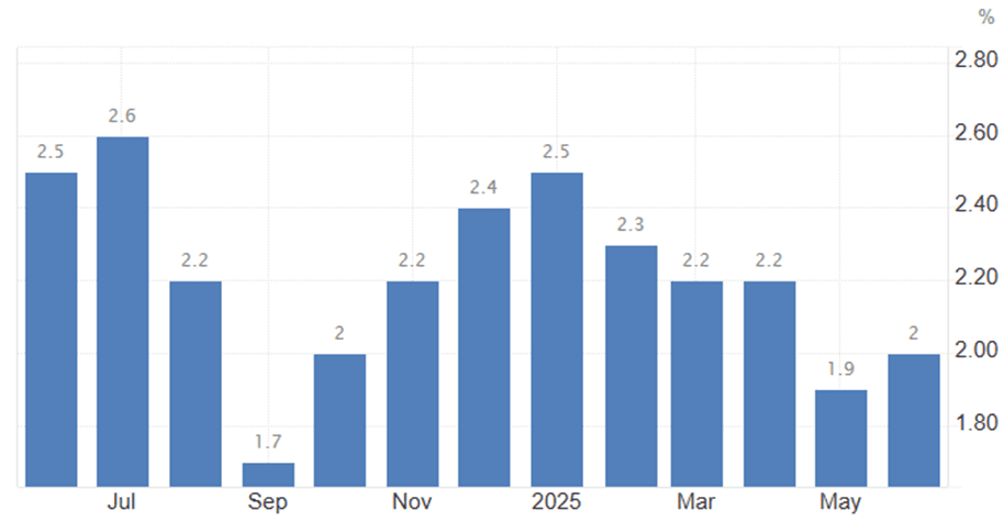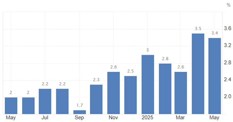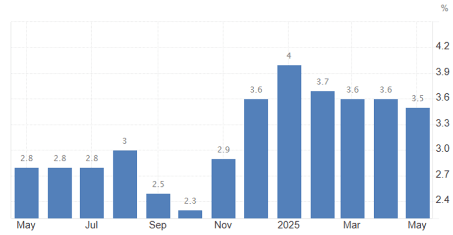 La tasa de inflación de Japón alcanzó el 3,5 % interanual en mayo, y se espera que la cifra de junio aumente ligeramente hasta el 3,7 %. Este incremento previsto se debería a las presiones persistentes sobre los costos de los alimentos y la energía, junto con un yen más débil que ha encarecido las importaciones. Además, las continuas alzas salariales y los mayores costos de los insumos podrían estar aumentando gradualmente los precios al consumidor. Este dato se dará a conocer el 17 de julio a las 23:30 GMT.