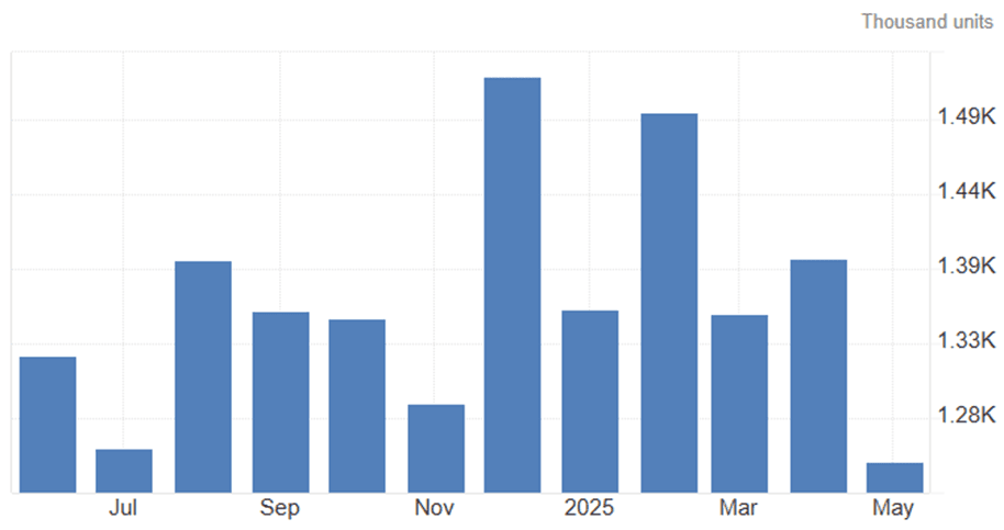 Los inicios de viviendas en EE. UU. se ubicaron en 1256 millones en mayo, y se proyecta que la cifra de junio aumente a 1290 millones. Este aumento proyectado podría deberse a que los constructores estarían respondiendo a una demanda estable, particularmente en el segmento de viviendas unifamiliares. Si bien las altas tasas hipotecarias siguen siendo un obstáculo, las mejores condiciones de la cadena de suministro y la actividad estacional del verano podrían respaldar el repunte esperado. El dato se publicará el 18 de julio a las 12:30 GMT.