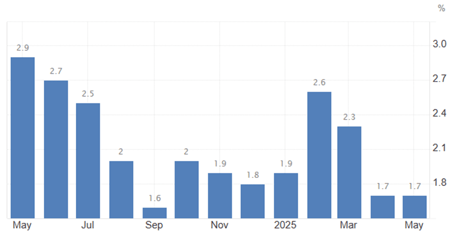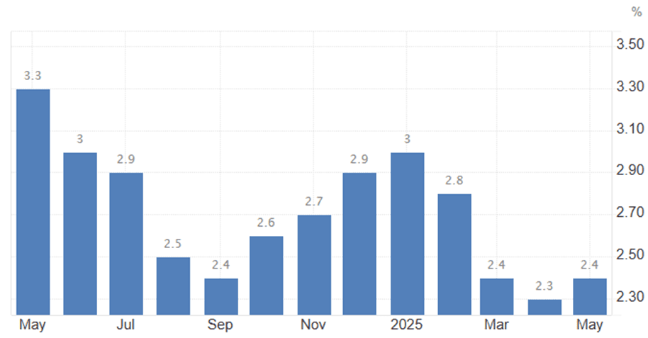 La tasa de inflación de EE. UU. se situó en el 2,4 % interanual en mayo, y se espera que la próxima lectura aumente ligeramente hasta el 2,5 %. Este leve repunte podría deberse a las presiones constantes sobre los precios de los servicios, en particular en los sectores de vivienda y salud, que no bajan pese a la desinflación de los bienes. Además, los recientes aumentos de los precios de la energía y una demanda de los consumidores robusta podrían contribuir al ajuste al alza. De ser así, la inflación estaría ligeramente por encima del objetivo del 2 % de la Fed. El dato se publicará el 15 de julio a las 12:30 GMT.