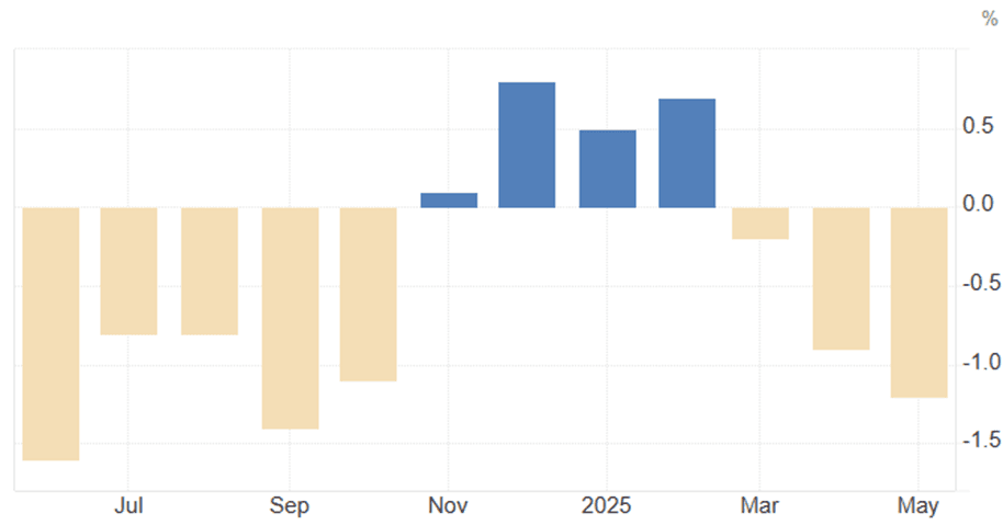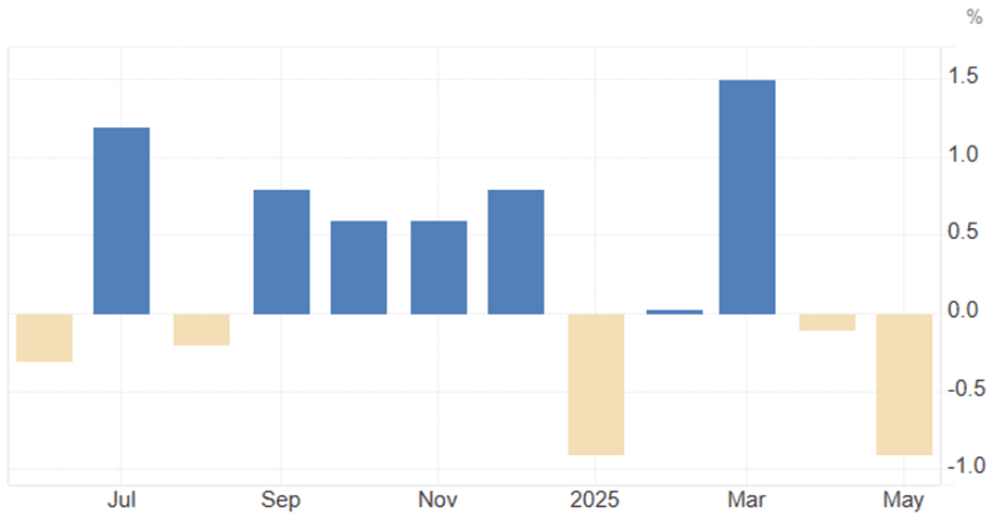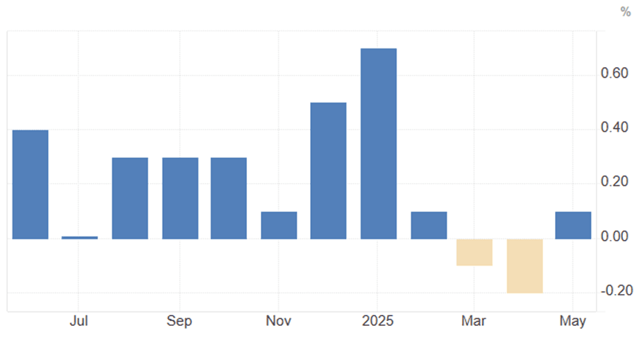 Las ventas minoristas en EE. UU. descendieron un 0,9 % intermensual en mayo, pero se prevé un modesto repunte del 0,2 % para junio. Esta posible recuperación sería una respuesta a la mejora de la confianza del consumidor, a un mayor gasto en servicios, y a factores estacionales como los viajes de verano y el regreso a las escuelas. La fuerte caída de mayo pudo ser una anomalía provocada por un menor gasto discrecional. En contraste, la previsión de junio apunta a una actividad de consumo más normalizada. El dato se publicará el 17 de julio a las 12:30 GMT.