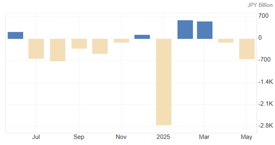 La balanza comercial de Japón mostró un déficit de 637 600 millones de yenes en mayo. Sin embargo, se espera una reducción considerable en junio, hasta un déficit de 100 000 millones de yenes. Esta mejora se debería a un repunte de las exportaciones, en especial de automóviles y productos electrónicos, junto con una caída estacional de las importaciones de energía. Por su parte, la debilidad del yen pudo haber mejorado la competitividad de las exportaciones, lo que podría reducir el déficit comercial. El dato se publicará el 16 de julio a las 23:50 GMT.