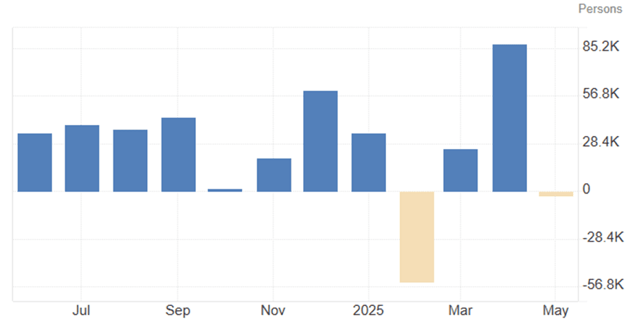La variación del empleo en Australia fue de -2,5k en mayo, pero se anticipa un fuerte repunte en junio, con una previsión de +25k. Esta proyección optimista podría deberse a una corrección de la inesperada cifra baja del mes anterior, la cual pudo estar alterada por factores estacionales o estadísticos. Además, junio usualmente registra una mayor actividad de contratación, y las encuestas empresariales recientes indican una demanda laboral estable, principalmente en servicios y construcción. Todo esto respalda la previsión de una fuerte recuperación del empleo. El dato se publicará el 17 de julio a las 01:30 GMT.