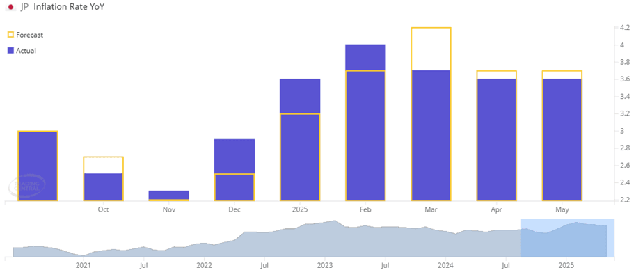 La inflación anual de Japón se situó en el 3,6 % en abril, y se espera la misma cifra para mayo. Esta previsión estable mostraría la persistencia de la presión inflacionaria subyacente, en especial en componentes diferentes a la energía, como alimentos y servicios. Además, la inflación subyacente de Tokio en mayo (que suele ser un indicador adelantado del dato nacional) también fue del 3,6 %, lo que refuerza la expectativa del mercado de que el IPC nacional no cambie. Estos datos se publicarán el 19 de junio a las 23:30 GMT.