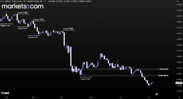 From a technical analysis perspective, the USD/CHF currency pair has been trending lower, as reflected by the formation of lower highs and lower lows. Recently, the pair broke below the order block at 0.8055 – 0.8085 with strong bearish momentum, confirmed by a series of consecutive bearish candlesticks. This sustained downward pressure suggests that bearish momentum remains in control and could potentially drive the pair even lower.