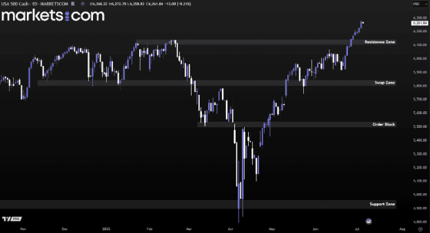 From a technical analysis perspective, the S&P 500 index has been rebounding from the support zone of 4,900 – 4,960 since early April 2025, as evidenced by the formation of higher highs and higher lows. Recently, it broke above the resistance zone of 6,100 – 6,140, forming a new higher high. With such a strong breakout and sustained bullish momentum, the index may continue its upward trajectory unless a significant bearish reversal pattern or confluence of signals suggests a potential pullback.