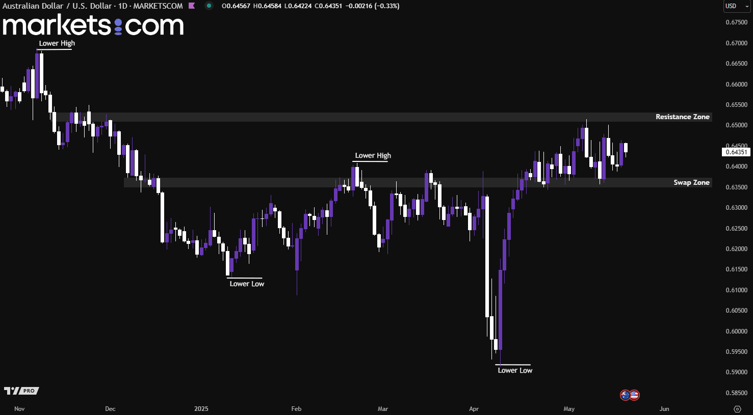 From a technical analysis perspective, the AUD/USD currency pair has been in a bullish trend since early April 2025, as indicated by a series of higher highs and higher lows. Currently, the pair is trading within the range between the swap zone of 0.6350 – 0.6370 and the resistance zone of 0.6510 – 0.6530. A decisive breakout in either direction could potentially determine the next major move for the currency pair.