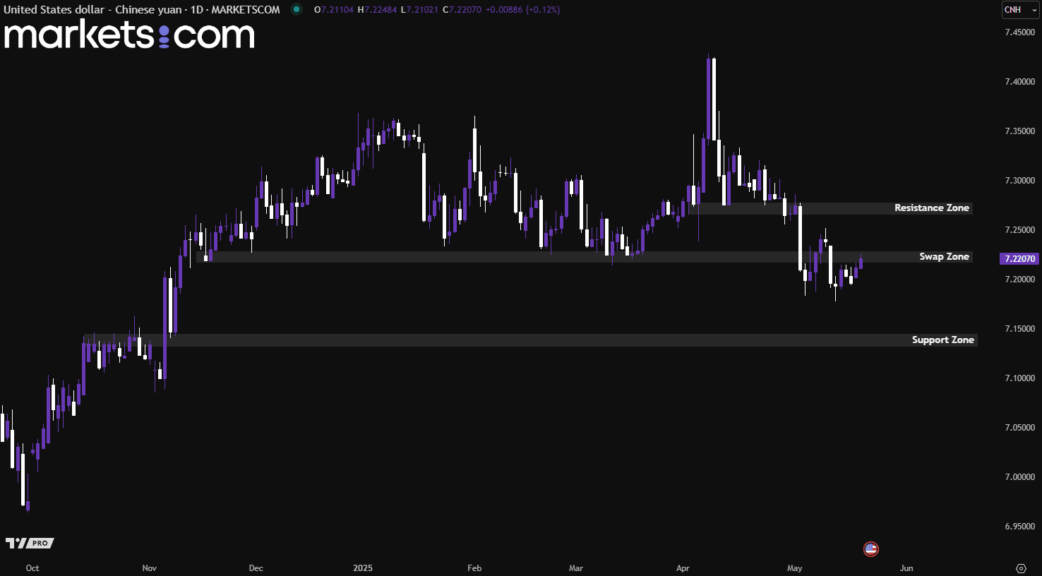 From a technical analysis perspective, the USD/CNH currency pair recently broke below the swap zone of 7.2160 – 7.2290 and is now retesting it. If it can close above this zone, the pair has the potential to move higher and retest the resistance area between 7.2650 and 7.2780. Conversely, if it breaks back below the swap zone, it may move lower to retest the support area between 7.1320 and 7.1450.