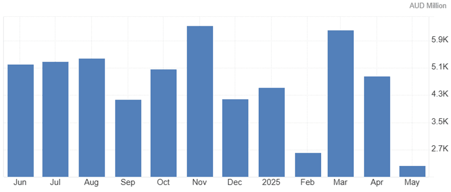 La bilancia commerciale australiana di maggio 2025 si è attestata a 2.238 miliardi di dollari australiani, segnando un forte calo rispetto ai mesi precedenti. Per giugno, il valore previsto è un significativo rimbalzo a 6,8 miliardi di dollari australiani, grazie al rafforzamento delle esportazioni, in particolare di materie prime come il minerale di ferro e il GNL, in seguito al miglioramento della domanda globale e alla stabilizzazione dei prezzi. Inoltre, un leggero calo delle importazioni dovuto all'indebolimento dei consumi interni potrebbe contribuire all'aumento dell'avanzo. Le previsioni indicano che il dato di maggio è stato un caso anomalo e che giugno dovrebbe riflettere un ritorno a dinamiche commerciali più tipiche. I dati saranno resi noti il 7 agosto alle 0130 GMT.