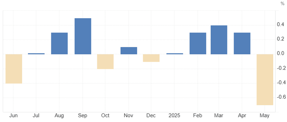 Il dato più recente del CPI Svizzera m/m è +0,2% per giugno 2025, leggermente al di sopra delle previsioni a causa degli aumenti stagionali di alimentari e servizi. Poiché il valore previsto per luglio non è ancora disponibile, prevediamo che rimanga a +0,2%, a causa della stabilità dei prezzi dell'energia, del franco forte e della debolezza della domanda interna. Nonostante un'inflazione contenuta, i modesti aumenti dei prezzi in alcuni settori dovrebbero sostenere un lieve aumento mensile. I dati saranno pubblicati il 4 agosto alle 0630 GMT.