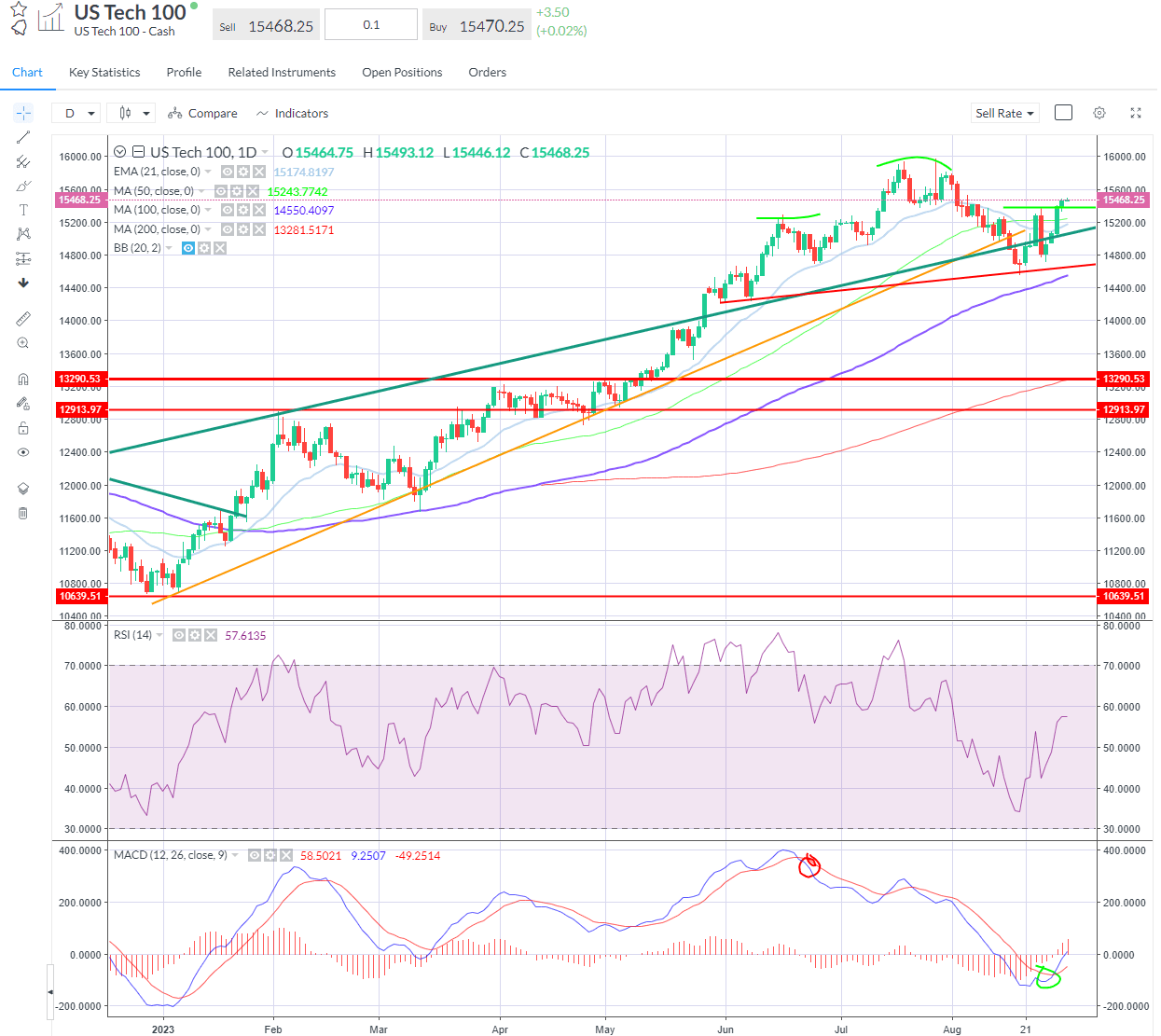 Modest gains were registered in London on Wednesday to keep the run going for a sixth day, taking its August dip to below 3%. Glencore fell 5% after going ex-divi. Stocks in London were flattish in early trade on Thursday running into the final day of trading for the month, whilst Frankfurt rallied two-thirds of a percent to touch 16k again. Futures on Wall Street are positive as the main indices attempt to break out of some head and shoulders-like tops(chart 1). Salesforce, a Dow component, rallied 5% after topping earnings expectations and delivering an upbeat outlook.