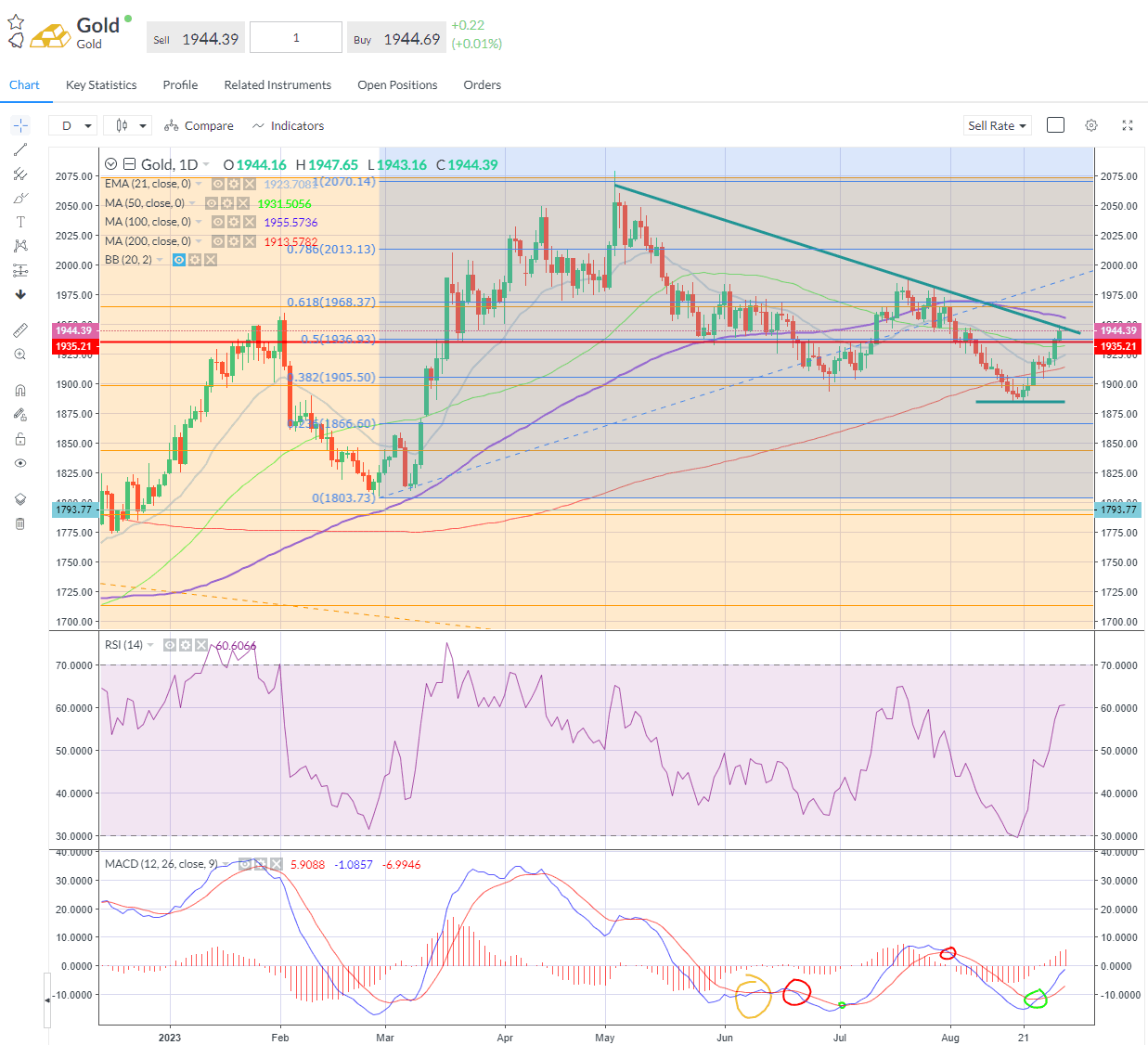 US Q2 GDP a bit lighter than expected, ADP miss + JOLTS = jobs rolling over maybe...could be the soft landing that the dollar bears are looking for – they are certainly trading it thus right now with DXY futures down hard again to test the 21-day EMA and then the 200-day at 102.84 before steadying this morning above 103. The US Treasury 2yr/10yr yield curve inversion narrowed to 74bps – the resteepening tell. September may be a pause for the Fed but the new dot plot will tell the market whether there is still one more hike left in the tank – currently expected in November. Gold is firming further, building on the bullish MACD crossover but now facing trend resistance around $1,942 (chart 2).