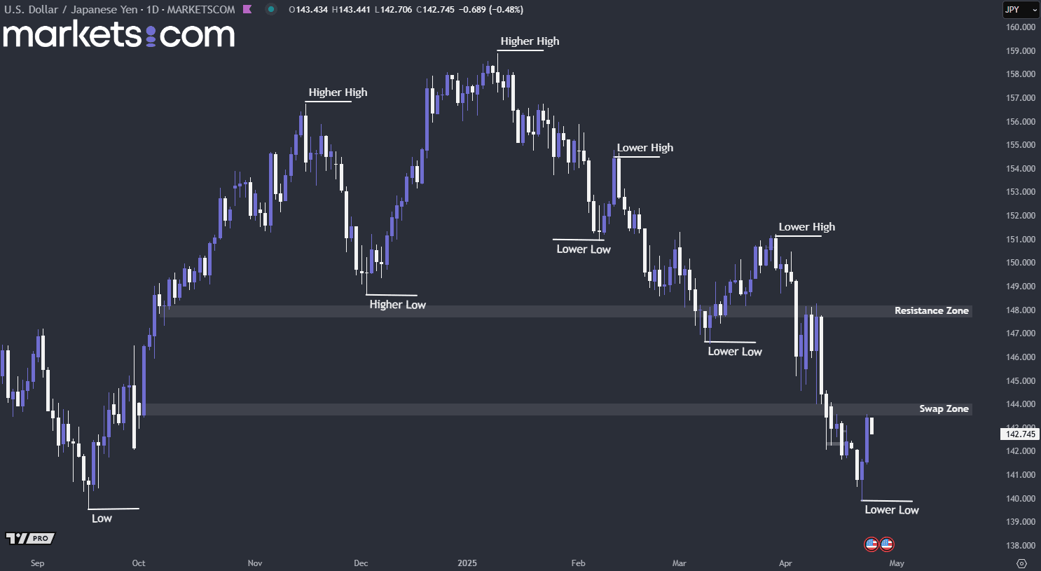 From a technical analysis perspective, the USD/JPY currency pair has been in a bearish trend since the beginning of January 2025, as evidenced by a series of lower highs and lower lows. Recently, the pair rebounded from the previous swing low at 140.00, retested the swap zone between 143.50 and 144.00, and was temporarily rejected. However, if it manages to close above this zone in the near term, it may potentially rise further to retest the resistance area between 147.70 and 148.20.