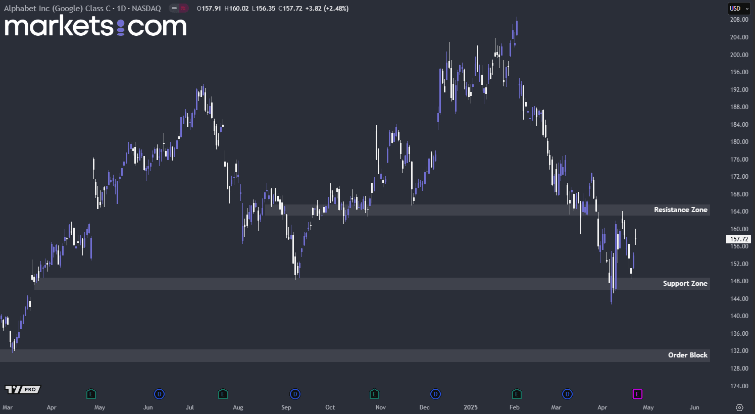 From a technical analysis perspective, Alphabet’s share price has been in a bearish trend since the beginning of February 2025, as indicated by a series of lower highs and lower lows. Over the past two weeks, the price has been oscillating between the support zone of 146 – 149 and the resistance zone of 163 – 166. If it breaks above the resistance zone in the near term, it suggests that the bullish structure remains intact, and the price may potentially move higher. Conversely, a break below the support zone might drive the price lower, with a possible retest of the order block in the 130–133 range.