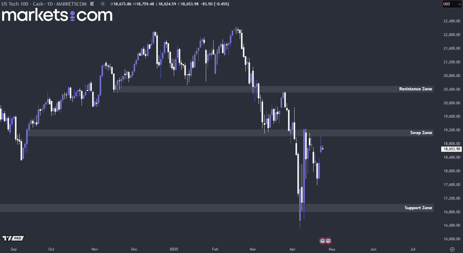 From a technical analysis perspective, the US 100 index has been in a bearish trend since mid-February 2025, as indicated by a pattern of lower highs and lower lows. If it closes above the swap zone between 19,000 and 19,200 in the near term, it may potentially surge upward to retest the resistance zone at 20,300 – 20,500. Conversely, if the index is rejected at the swap zone with bearish momentum, it could potentially move lower.