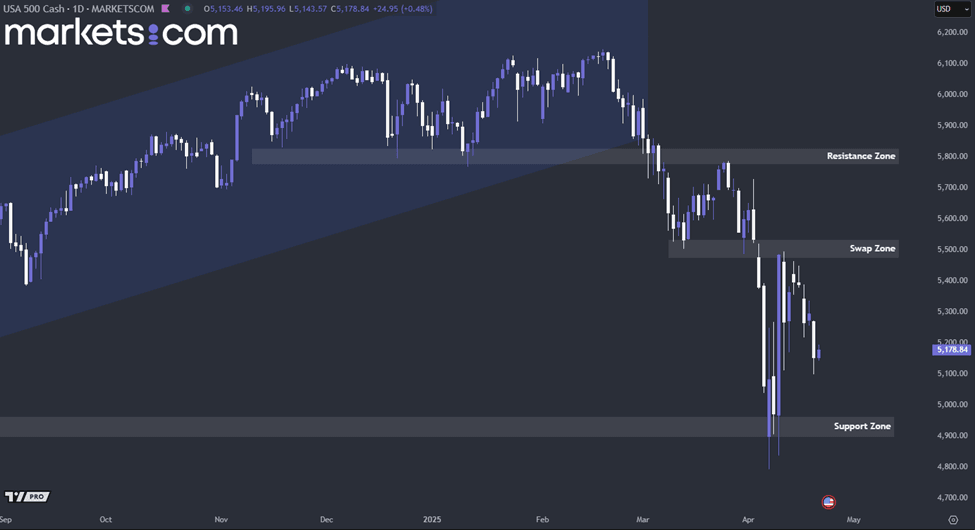 From a technical analysis perspective, the US500 index has been in a bearish trend since the end of February 2025, as evidenced by the formation of lower highs and lower lows. Recently, it retested the swap zone between 5,480 and 5,530 but was rejected, with bearish momentum driving the index lower. This valid bearish pressure could potentially push the index down to retest the support zone between 4,900 and 4,960.