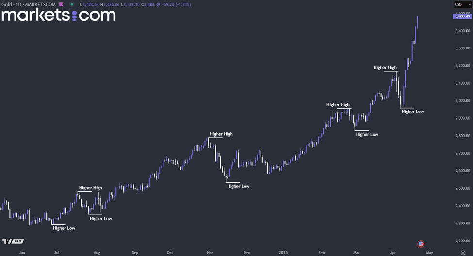 From a technical analysis perspective, the price of gold is moving in a bullish trend, as indicated by the higher highs and higher lows. Currently, the price is at an all-time high, nearing the key psychological level of $3,500. If a bearish structure, for example, a head and shoulder, double top, or shooting star pattern forms near this area, a technical correction might occur, driving the price lower. Conversely, the price of gold is likely to surge higher.