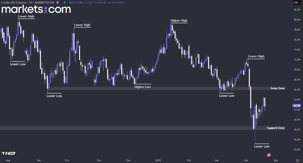 Despite the bounce, broader concerns continue to weigh on sentiment. Ongoing uncertainty around US monetary policy and escalating tariffs have raised the risk of an economic slowdown, which could weaken fuel demand. Therefore, oil could remain range-bound between $55 and $65 in the near term.