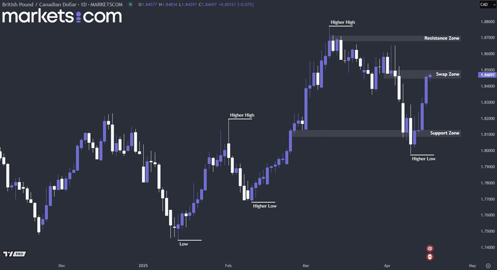From a technical analysis perspective, the GBP/CAD currency pair has been in a bullish trend since mid-January 2025, as indicated by the formation of higher highs and higher lows. Recently, it rebounded from the support zone of 1.8080 – 1.8130 and is currently retesting the swap zone of 1.8450 – 1.8500. A successful breakout above this swap zone could potentially lead the pair higher to retest the resistance area of 1.8680 – 1.8720.
