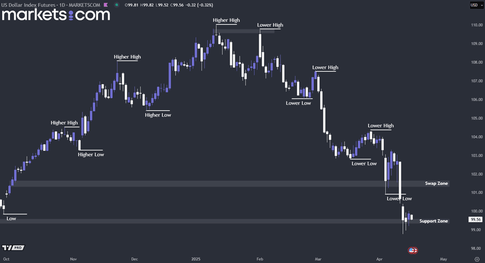 From a technical analysis perspective, the U.S. Dollar Index has been on a bearish trend since early February 2025, as evidenced by a series of lower highs and lower lows. It is currently retesting the support zone between 99.30 and 99.60. If the index finds support and rebounds from this level, it could potentially surge upward to retest the swap zone between 101.30 and 101.60. Conversely, a decisive break below the current support zone may trigger further downside momentum.