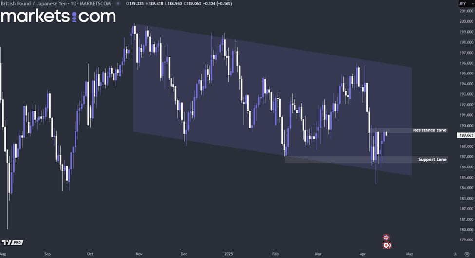 From a technical analysis perspective, the GBP/JPY currency pair has been in a bearish trend since late October 2024, as evidenced by the formation of lower highs and lower lows within a descending channel. Recently, the pair rebounded from the support zone of 186.40 – 187.00 and is currently retesting the resistance zone of 189.30 – 189.80. If it fails to break above this zone, the bearish momentum could potentially drive the pair back down to retest the support area. Conversely, a solid break above the resistance zone could fuel bullish momentum, pushing the pair higher.