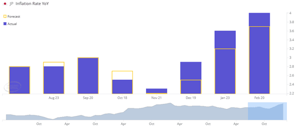Japan's year-over-year (YoY) inflation rate stood at 4.0% in January 2025, marking the highest level since January 2023. Moreover, Japan's core inflation has reached a 19-month high, indicating sustained price pressures beyond volatile food and energy components. Therefore, analysts anticipate that inflation will remain elevated for February, with the official data set to be released on March 20 at 23:30 GMT.