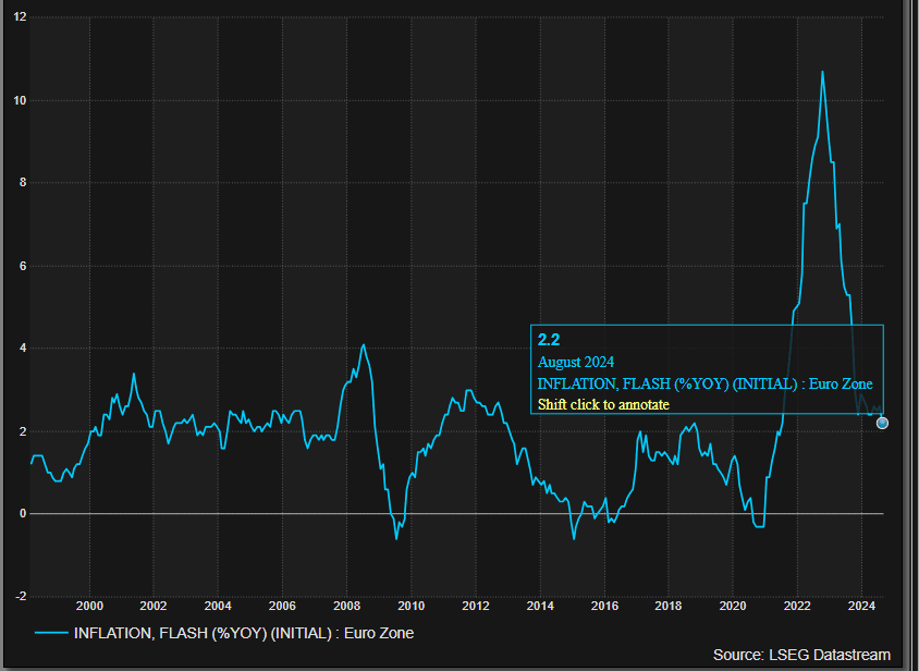 Eurozone inflation dropped to a three-year low of 2.2% in August, down from 2.6% in July. The core rate fell to 2.8% in August from 2.9% in July. US PCE inflation was in line at +2.5% and the core was a little light at 2.6% vs 2.7% expected. Good news for the Fed is it pins its colours to a rate cut in September.