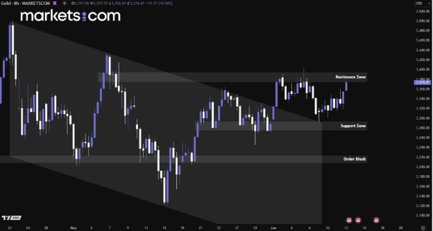 Gold climbed toward $3,370 per ounce on Thursday, driven by renewed safe-haven demand amid rising US-Iran tensions and soft US inflation data. The US ordered embassy staff to leave Baghdad after Iran warned of potential strikes on US bases should nuclear talks fail. Weak consumer inflation reinforced expectations of Federal Reserve rate cuts, adding further support to gold prices.