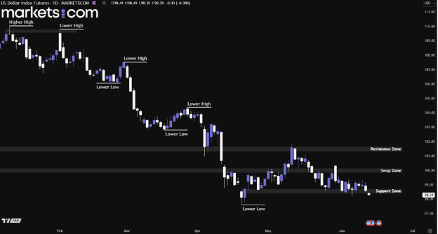 From a technical analysis perspective, the U.S. Dollar Index has been trending lower, as indicated by a series of lower highs and lower lows. Recently, it broke below the support zone between 98.40 and 98.70. If it fails to close back above this zone in the near term, it indicates that bearish momentum has taken control and may potentially drive the index even lower.