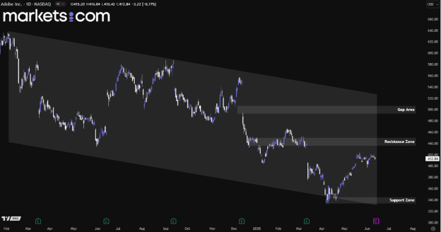 From a technical analysis perspective, Adobe's stock has been in a bearish trend since February 2024, as shown by a pattern of lower highs and lower lows. Recently, it rebounded from the lower boundary of the descending channel and the support zone between 334 and 345. The price is currently nearing the resistance zone at 435 to 450. A breakout above this level could lead to a move higher, potentially retesting the gap area between 492 and 507. Conversely, if bearish pressure holds this zone, the price may decline again to retest the support area.