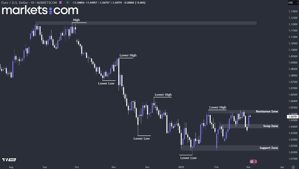 From a technical analysis perspective, the EUR/USD currency pair has been in a bearish trend since the end of September 2024, as indicated by the formation of lower highs and lower lows. However, it found strong support and rebounded at the beginning of January 2025. Currently, the price is nearing the resistance zone of 1.0500 – 1.0530. If it gets rejected from the resistance zone, there is a high probability that it will retest the swap zone of 1.0390 – 1.0420 to determine its next move.