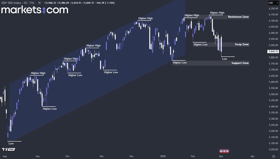 From a technical analysis perspective, the S&P 500 index has been in a bullish trend since early August 2024, as indicated by its pattern of higher highs and higher lows. However, bearish forces regained control after the index failed to break above the resistance zone in mid-February 2025.
