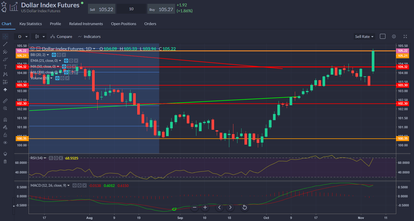 In his victory speech earlier, Donald Trump talked about paying down debt and cutting taxes. I guess the market would be right to think, ‘Well, which one is it gonna be?’ For now, it’s very much risk-on for US equities, and the dollar is back to the highs of the day, with DXY just hitting resistance once more at 105.30. The red wave = a strong US economy, but what about the dollar?