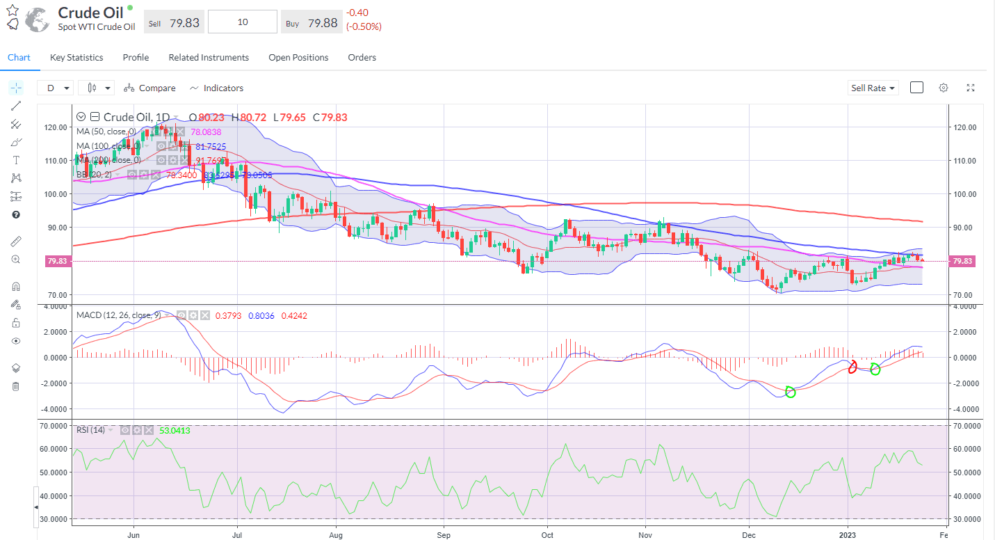 Crude oil continues to pull back from the 100-day line resistance. A possible retest of the 50day could see a bounce.