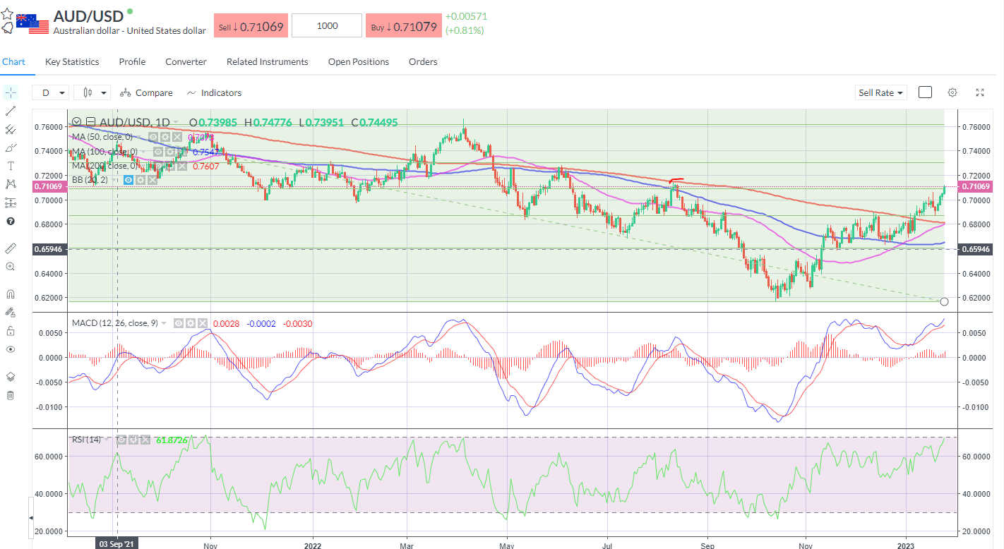 Australia’s dollar made strong headway to break out to a new 5-month high against its US counterpart after Australia’s inflation accelerated to the fastest pace in 32 years in Q4 2022. CPI rose 7.8% year-on-year vs the forecast 7.6%. This latest rise in inflation puts more pressure on the RBA to hike interest rates further – another 25bps hike in Feb looks assured now. It hiked rates by a combined 300bps last year and markets expect one or two more 25bps this year before peaking. Rising inflation might force a reset in market pricing for the terminal rate. Currently the market expects a 25bps in February to take the cash rate to 3.35%, with one more later in the year to hit 3.6%. China reopening is surely inflationary.