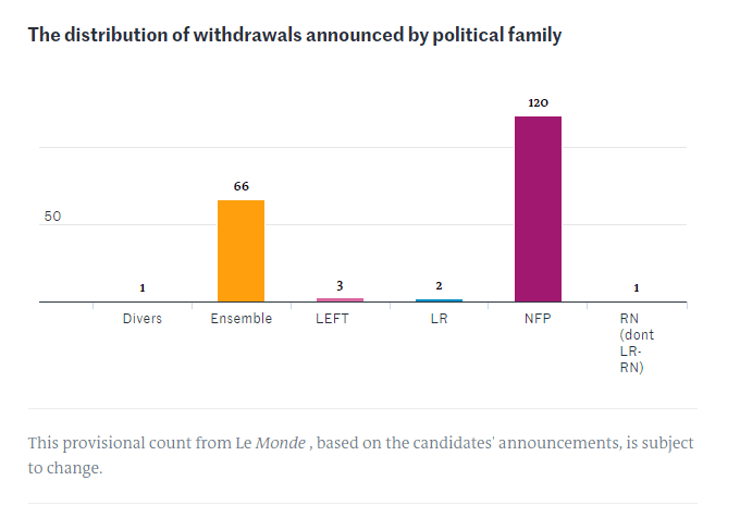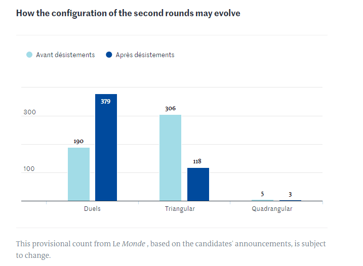 A lot will depend on who withdraws from the three-horse races. There have been about 190 withdrawals from around 300 three-way runoffs so far, leaving 121 three-ways, according to Le Monde – the deadline for applications is tonight.