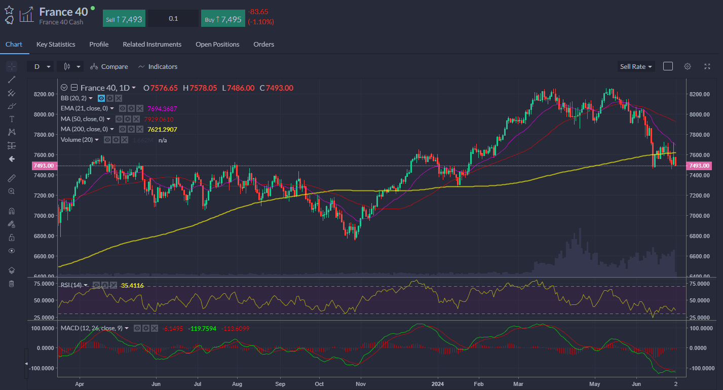 We should avoid getting too much into the weeds of the French system; it seems Marine Le Pen’s RN are looking at 260 seats as a worst-case scenario, which would not be enough for a majority, but it would take an unlikely, unholy and entirely unsustainable alliance of centrists and leftists to keep them out. The smart money here may be on an RN government – Le Pen says she would seek allies in the parliament should RN come up a few seats short of the 289 needed for an outright majority.