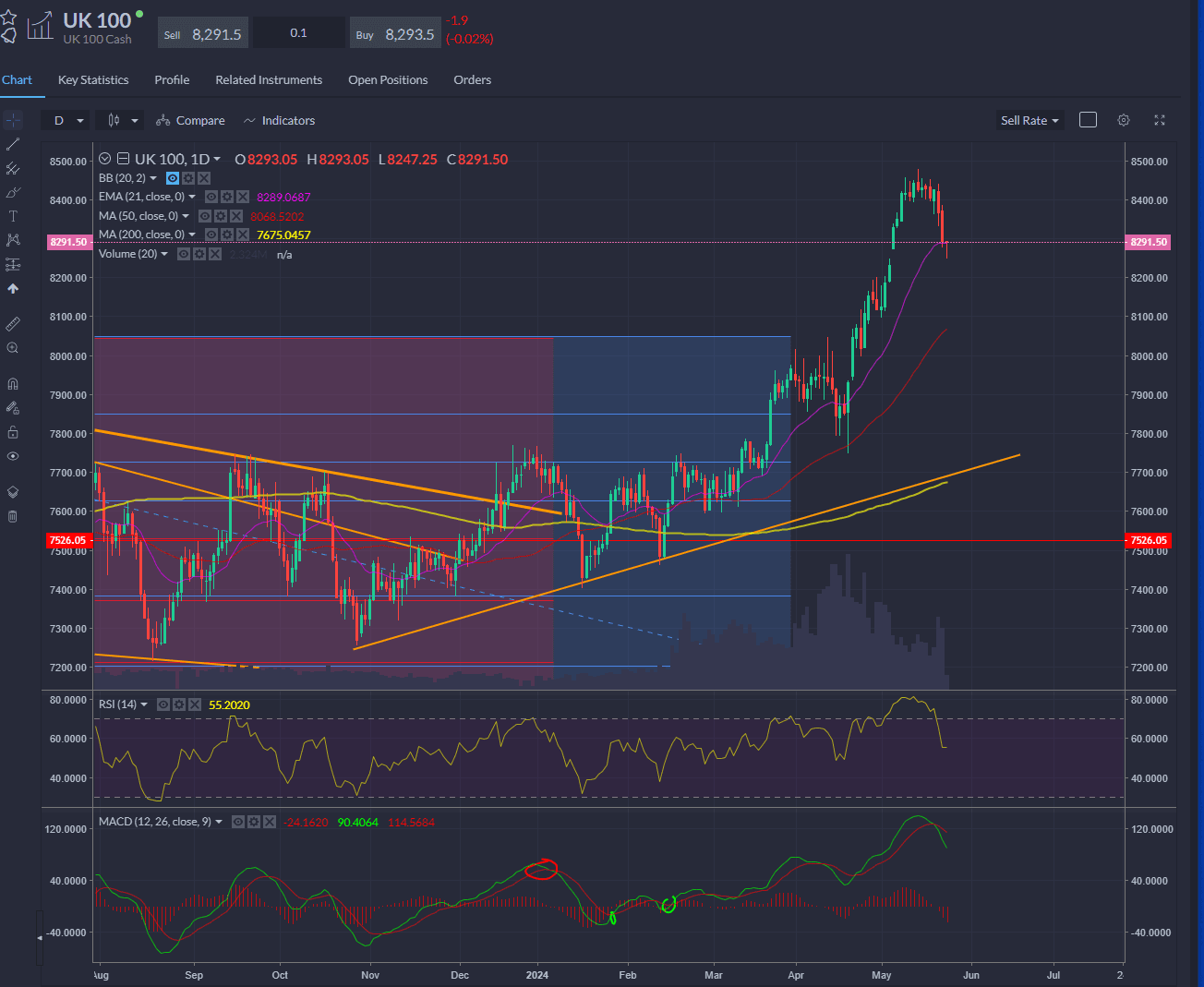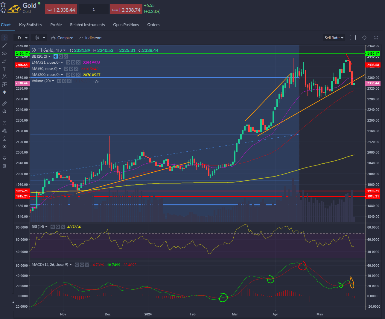 Commodities are taking a bit of a breather after a rollercoaster – copper fell again yesterday but has steadied at the 21-day EMA, gold price has likewise found temporary support at $2,325, with silver bouncing off $30.