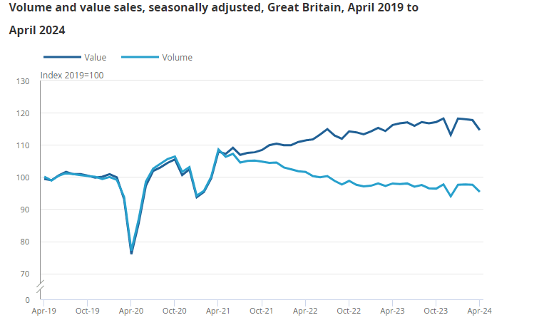 Ah, the weather. Yes, it’s been terrible. No, you cannot really blame it for crappy retail sales. Also, may I point out that whilst the value of UK retail sales has gone up this is entirely due to inflation – volumes have been declining since 2021 and are below pre-Covid levels.