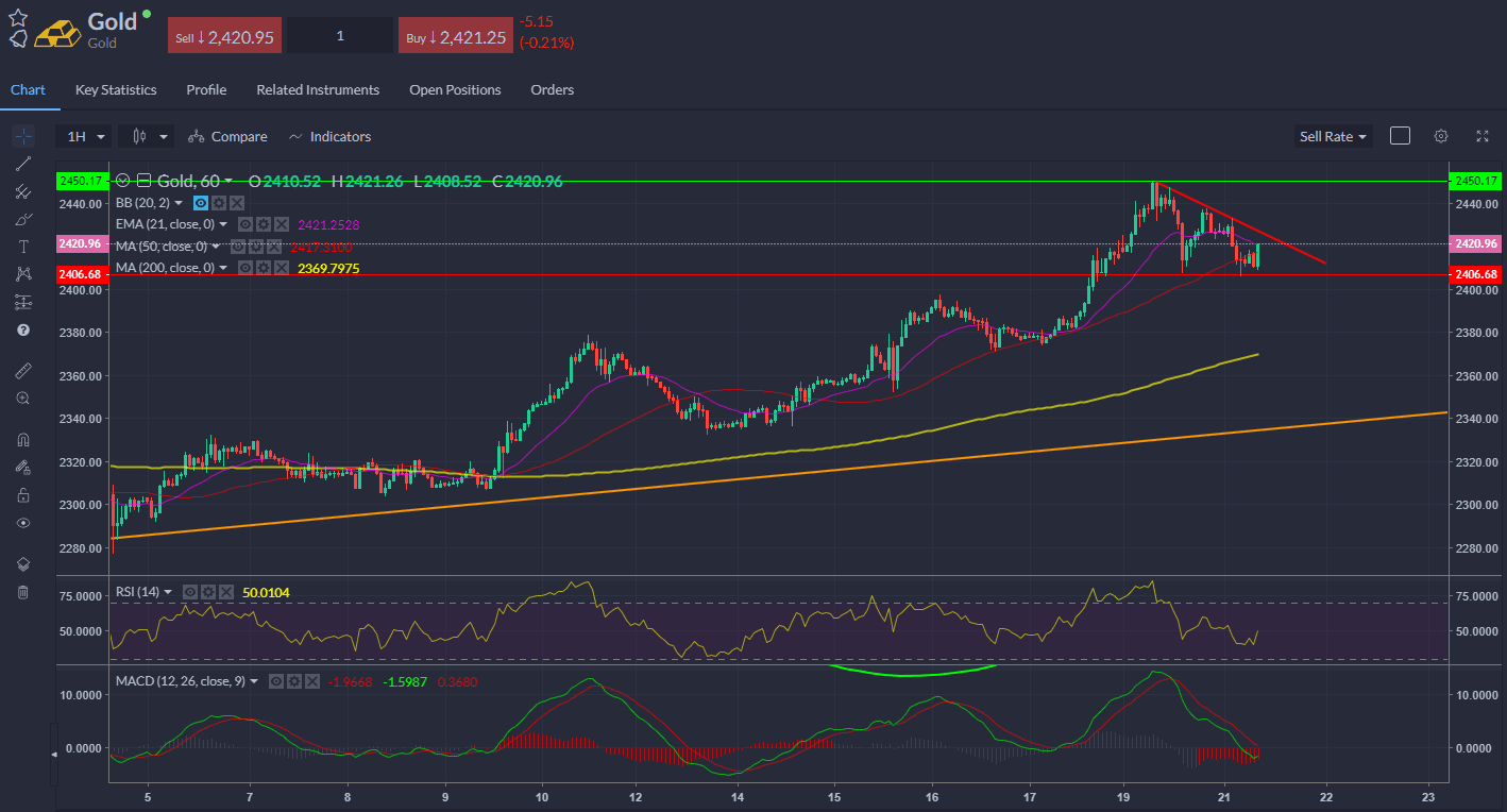 The gold price eased back from the record high above $2,240, oil retreated after closing below the 200-day line yesterday. Silver and copper also eased back a bit after racing higher.