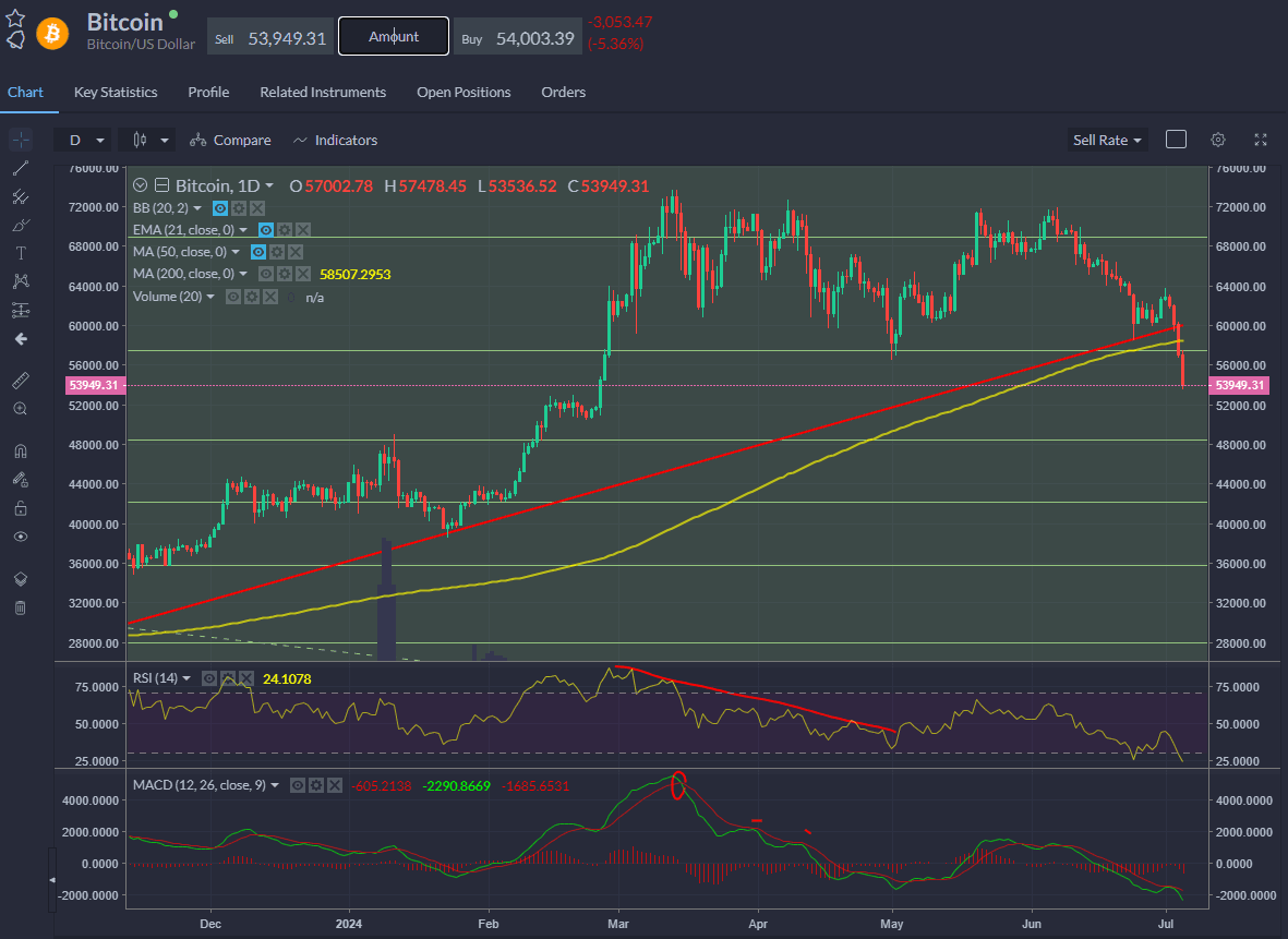 Bitcoin dropped further below the trend support and below its 200-day SMA.