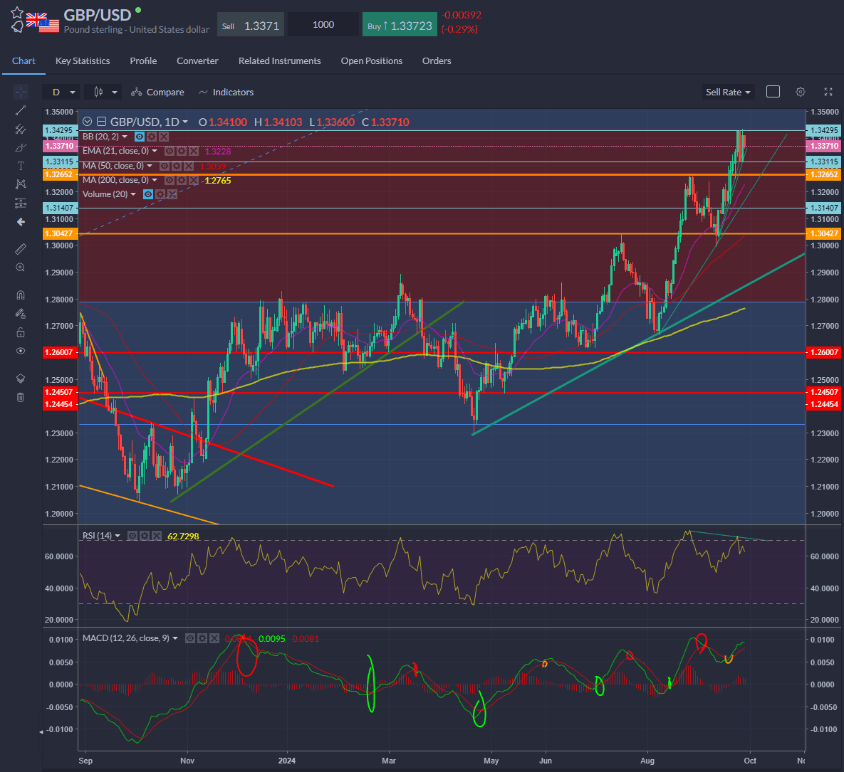 On the daily chart, we can see we’ve run into some pretty big long-term resistance and the RSI has diverged with the lower high made this week — we had a peak late August at 1.3260 area after the big one-way rally from the August 7th low around 1.2660 before a retrace. This peak could be in play if we see some froth come out of this trade.
