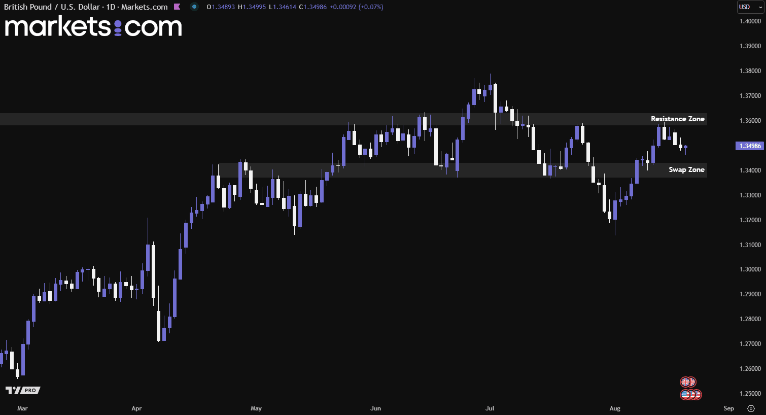 From a technical analysis perspective, the GBP/USD currency pair was recently rejected from the resistance zone of 1.3580 – 1.3630, pushing the pair lower and bringing it closer to the swap zone of 1.3370 – 1.3430. The ongoing bearish momentum could drive the pair to retest this zone. If the swap zone provides support, the pair may potentially resume an upward move. Conversely, a decisive break below this level with strong bearish momentum could lead to further downside.