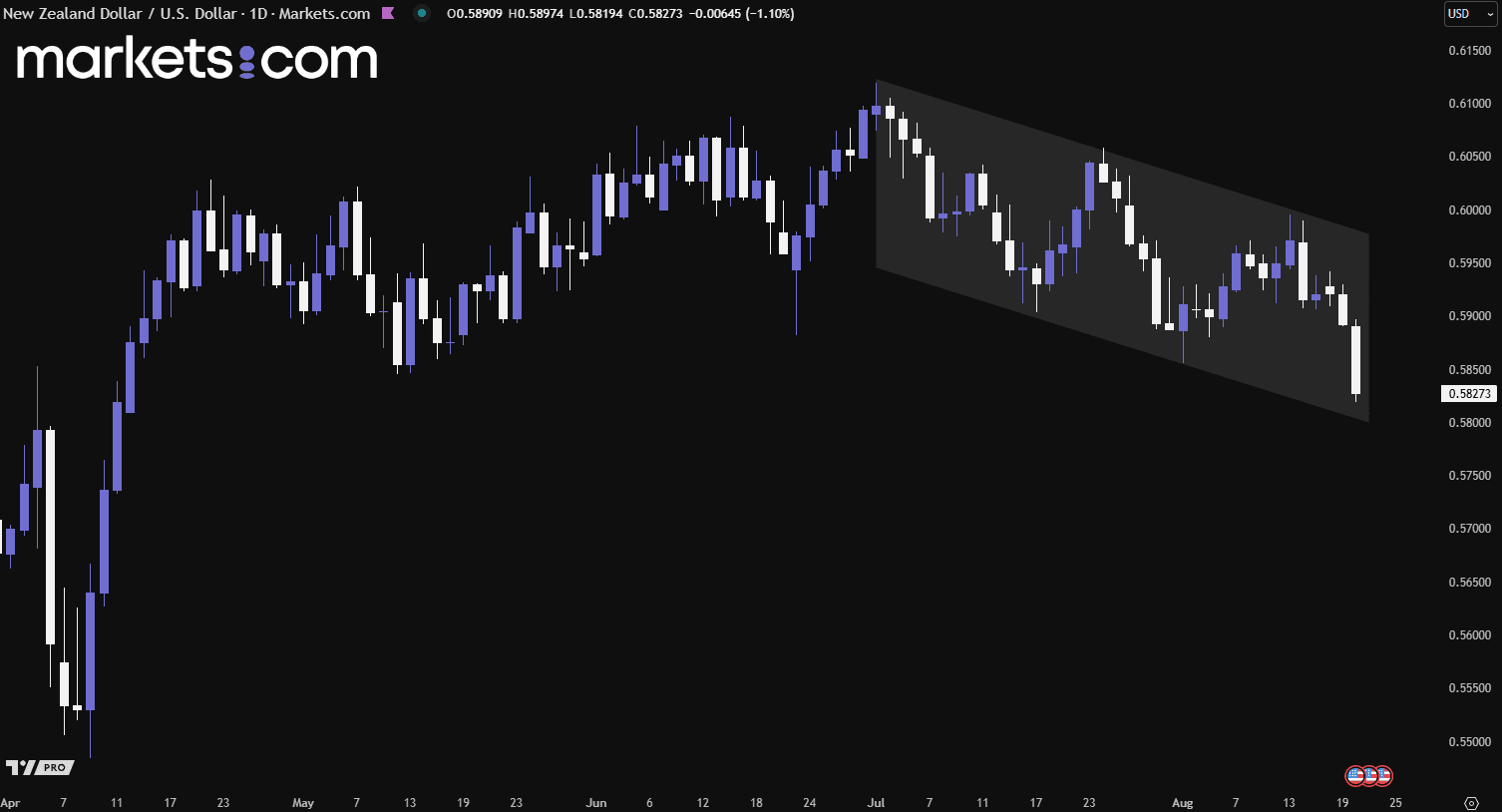 From a technical analysis perspective, the NZD/USD currency pair has been in a bearish trend since early July 2025, as shown by the formation of lower highs and lower lows within a descending channel. The pair continues to move lower with strong bearish momentum and may retest the channel’s lower boundary. A decisive break below this level with substantial bearish momentum could signal an overall trend shift to the downside, potentially driving the pair even lower.