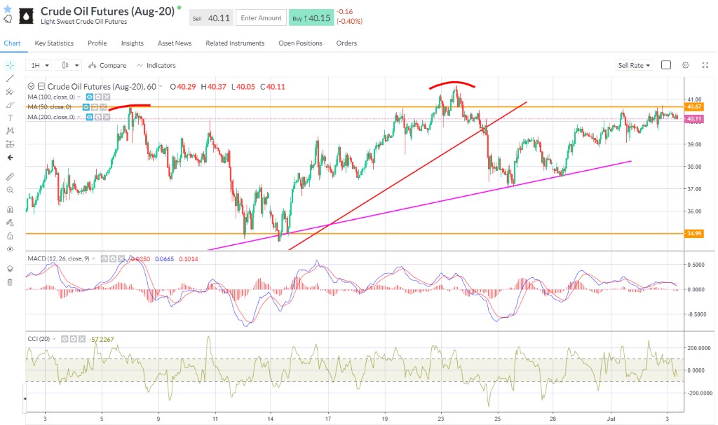 Oil (WTI-Aug) drifted higher to the top of the Jun 8th peak around $40.70 where it’s pulled back to the $40 round number. The move higher has been steadily losing momentum and failure at the $40.70 area suggests perhaps the progression of the double top into a head and shoulders reversal pattern.