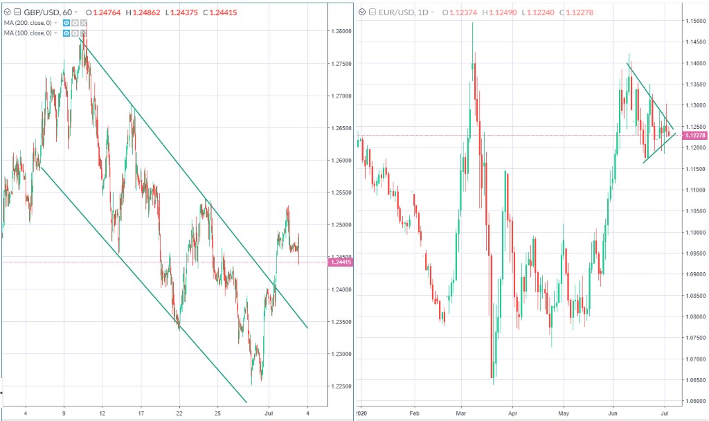 Meanwhile EURUSD has come back to 1.1230, the anchor point for the whole of June. This is the 23.6% retracement of the 2014-2016 top-to-bottom rout. As the bullish flag pattern nears completion, we should expect a breakout soon – the swing highs around 1.14-1.15 offering the main resistance.